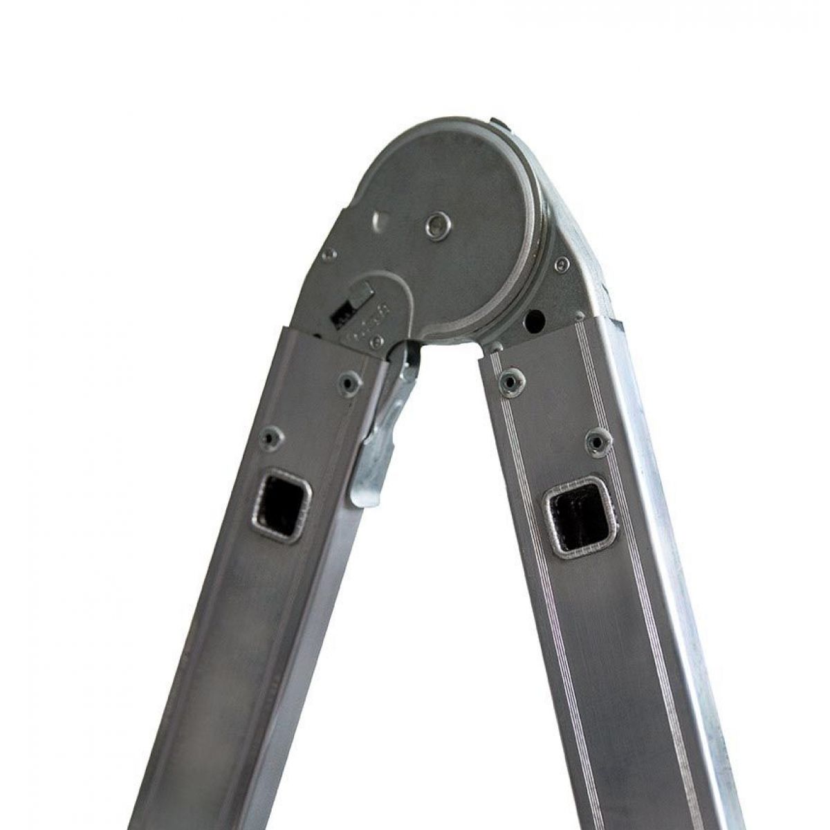 Лестница состоит из четырех секций, соединенных между собой стальными лестничными шарнирами с углами фиксации 35, 105 и 180 градусов. Поэтому такая лестница может принимать различные формы, такие как на рисунке.