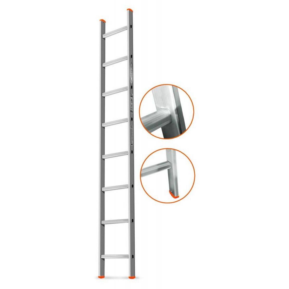 • Направляющие выполнены из эргономичного восьмигранного алюминиевого профиля 62 х 20 мм. Такой профиль удобно держать при переносе лестницы и при подъеме-спуске.