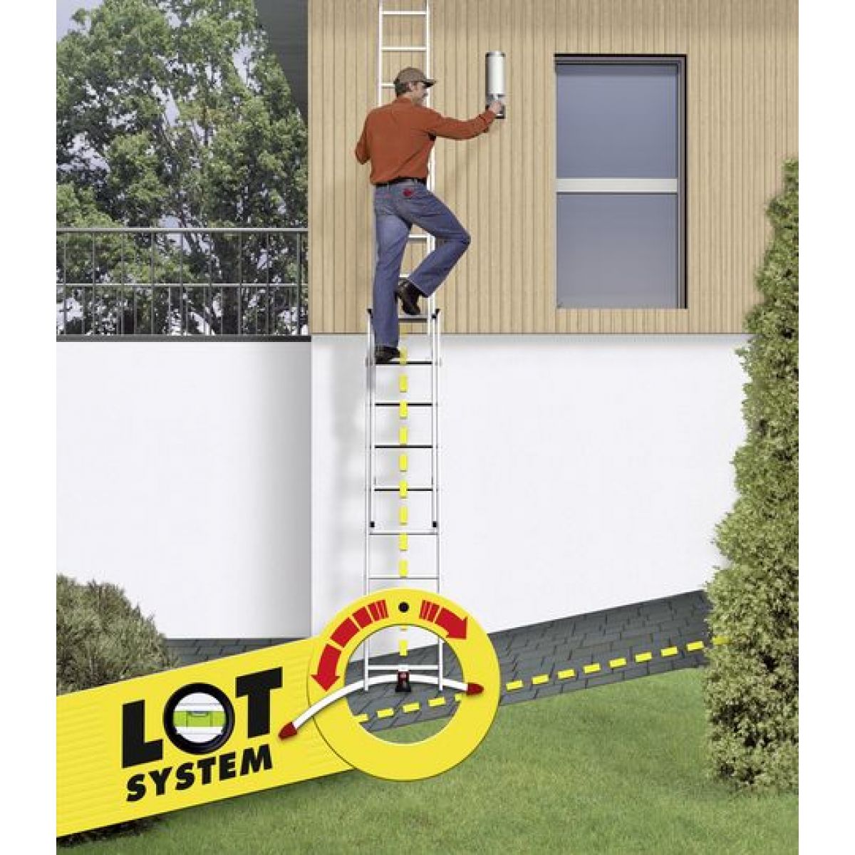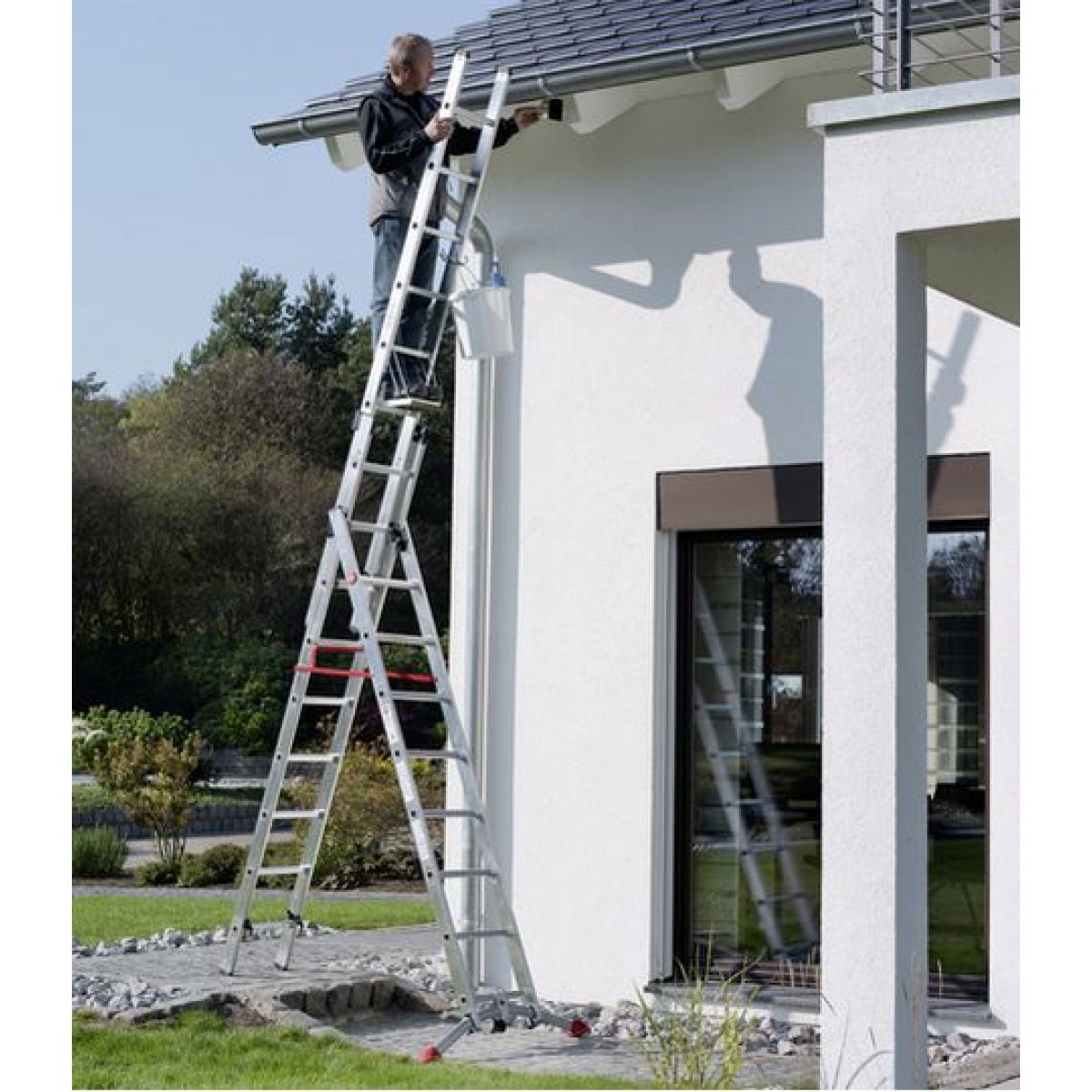 - Достаточно нажать ногой на педаль замка, и лестницу безопасно использовать и на неровной поверхности.