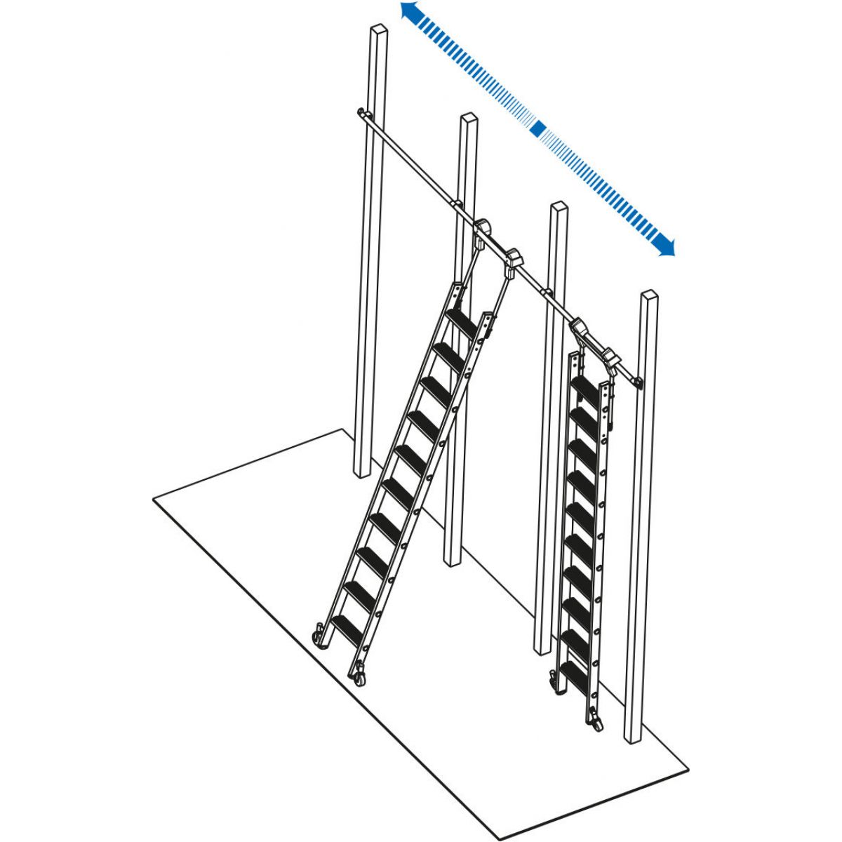 • Алюминиевая лестница для стеллажей, со ступеньками, со встроенным в верхней части блоком передвижения по круглой шине (O 30 мм)