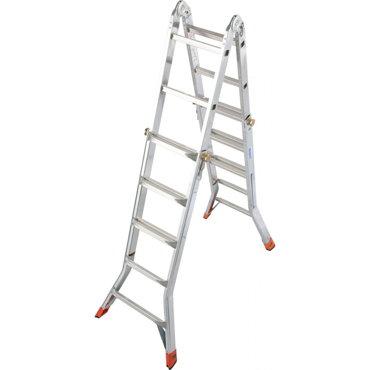 - Телескопическое пошаговое выдвижение наружной части стремянки от перекладины до перекладины позволяет приспособить стремянку к разным условиям работы