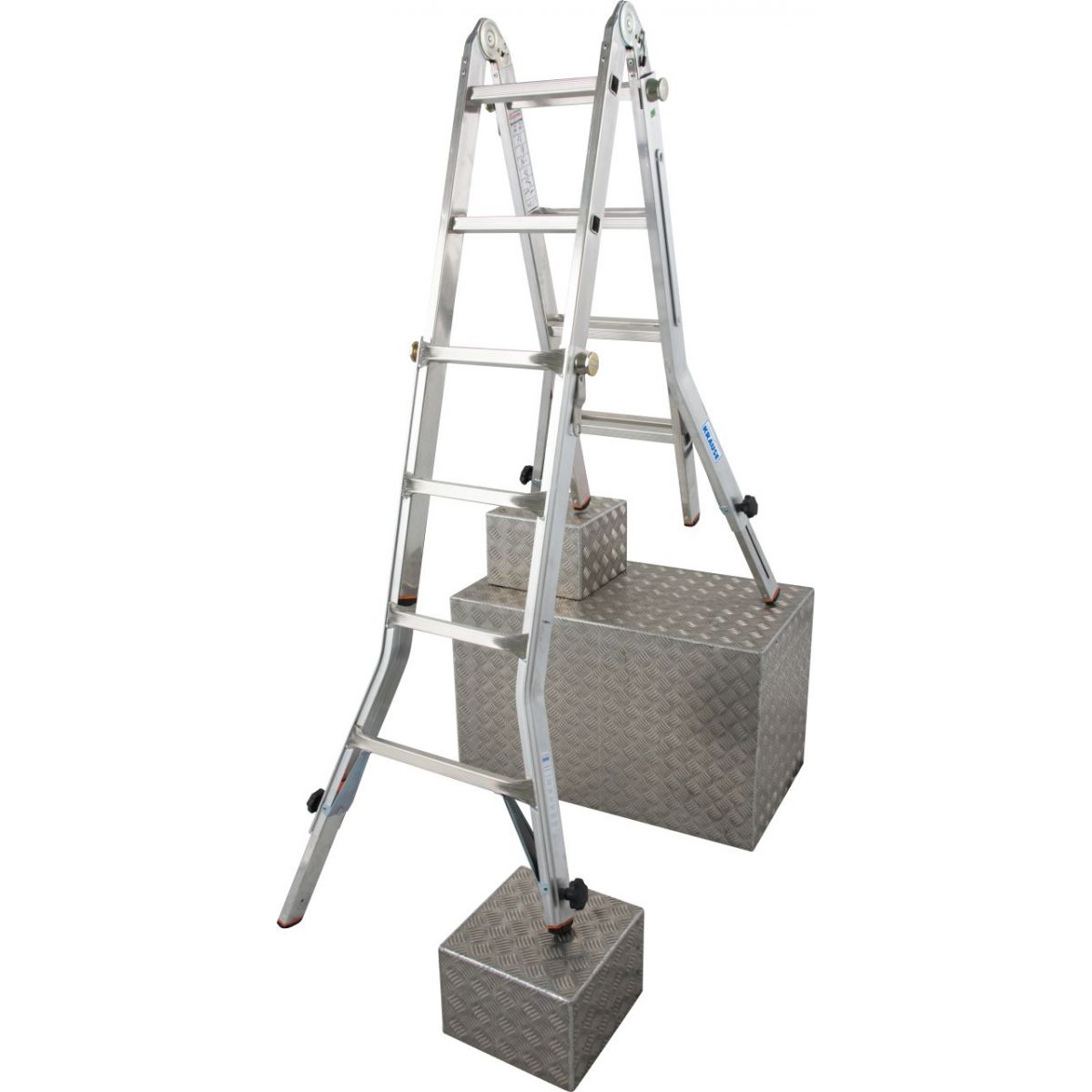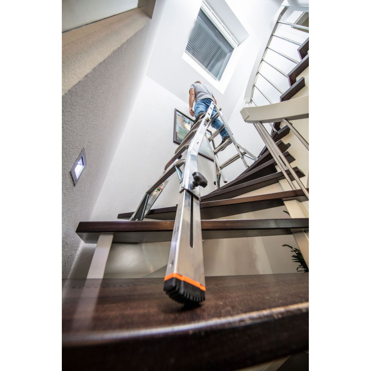 - Идеальная стремянка, так как каждая боковина, благодаря интегрированным удлинителям боковин, может выдвигаться, и таким образом может быть приспособлена к любим неровностям местности