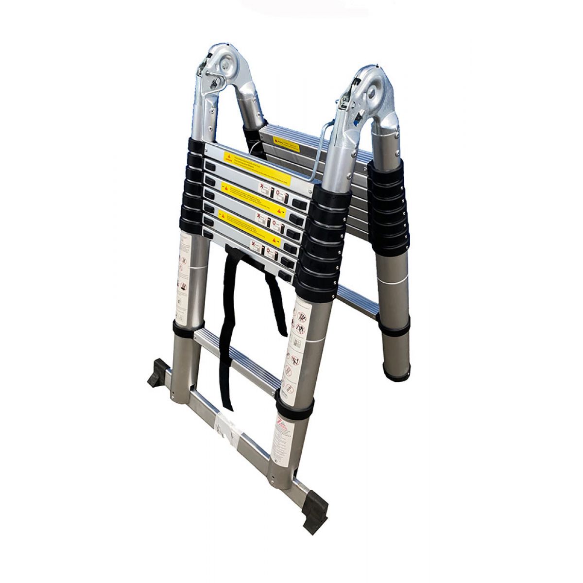 - Алюминиевая лестница используется как стремянка с двусторонним подъемом. Стальной шарнир фиксирует лестницу в двух положениях.