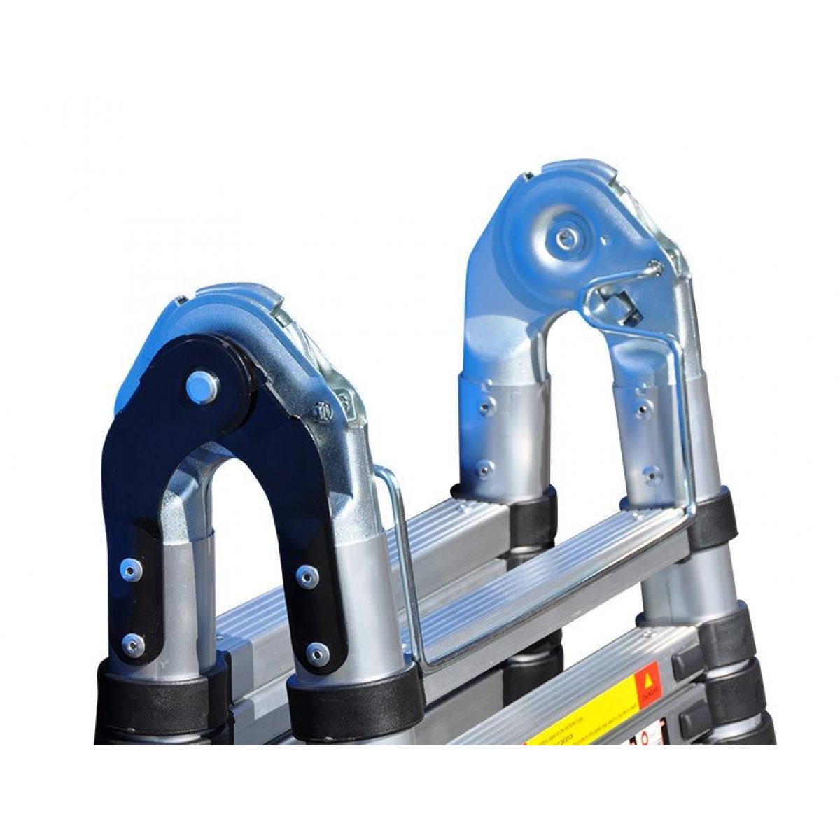 • Алюминиевая лестница используется как стремянка с двусторонним подъемом. Стальной шарнир фиксирует лестницу в двух положениях.