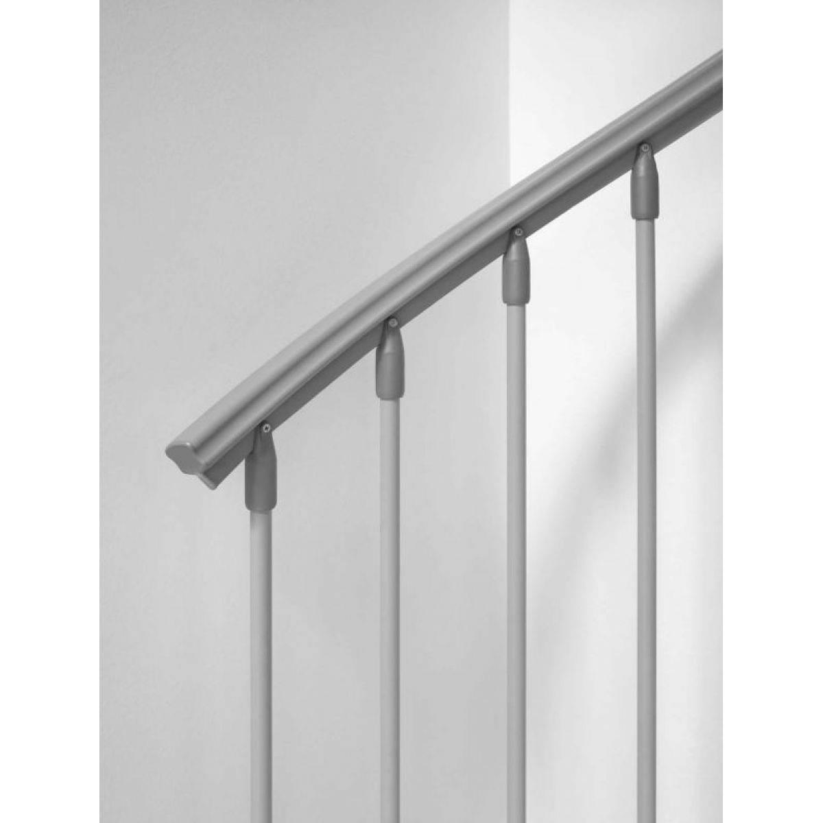 Поручень выполнен из поливинилхлорида и окрашен в серый цвет, как и металлические, части лестницы.