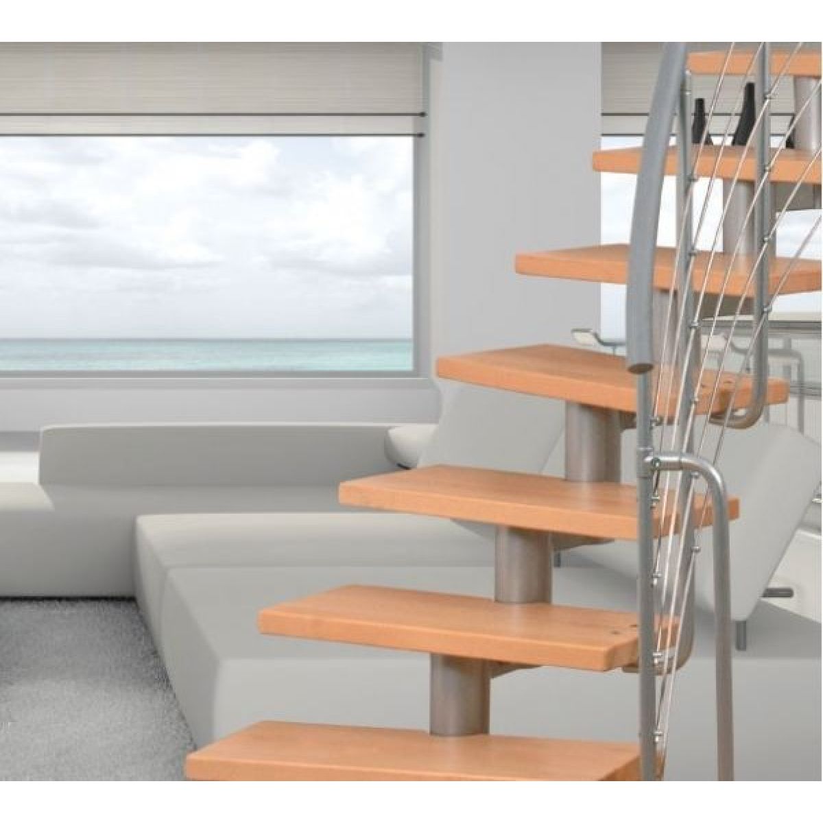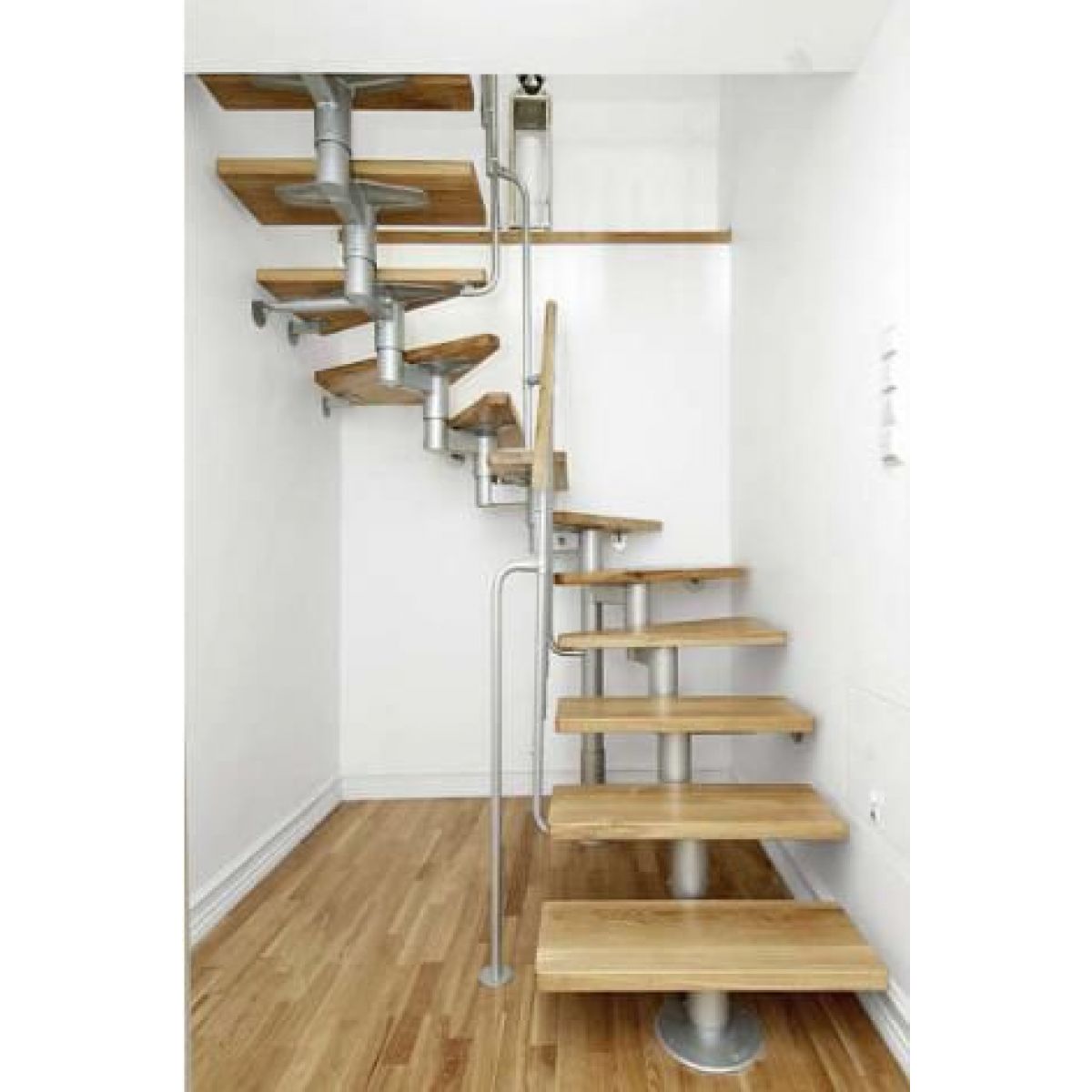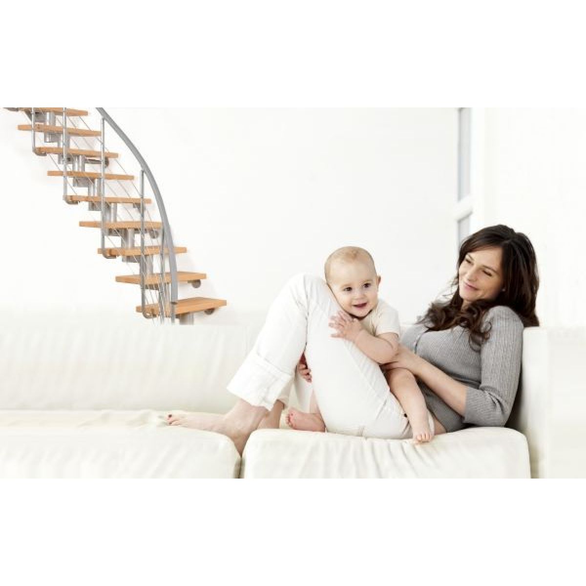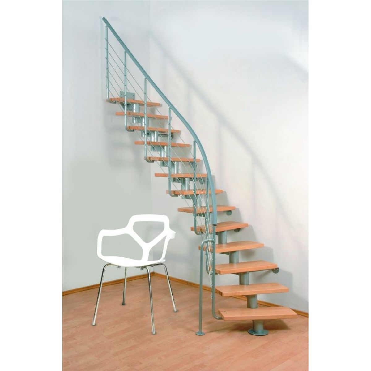 Среднего размера модульная лестница. Комфортная, но требует сравнительно мало места. Для использования в частных домах. Возможно разположить ее в прямом или закручивающим плане, а также с одним поворотом.