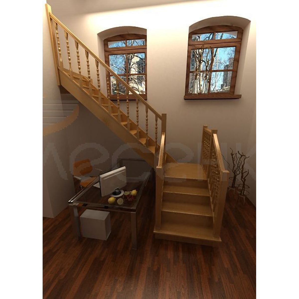 Деревянная лестница поставляется в разобранном виде в одной упаковке и собирается на объекте монтажа по указаниям приведённым в паспорте на лестницу.