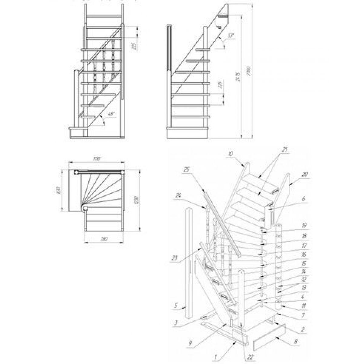 Материал: древесина хвойных пород 8% влажности. Колонна центральная и уголки крепления ступеней к тетивам — сталь; ступени, опорные столбы, тетивы — древесина.