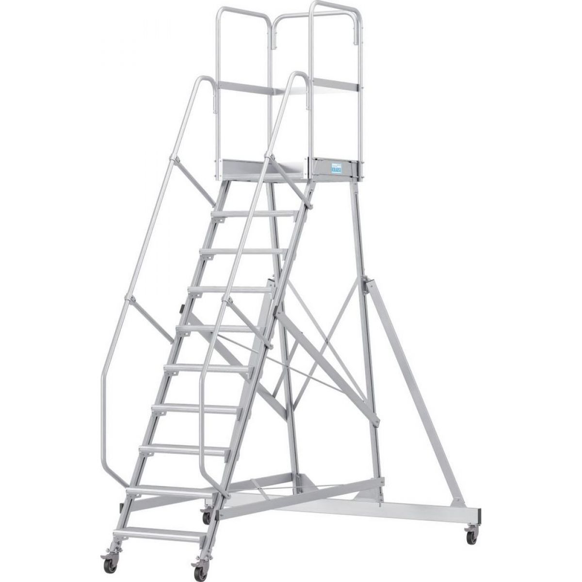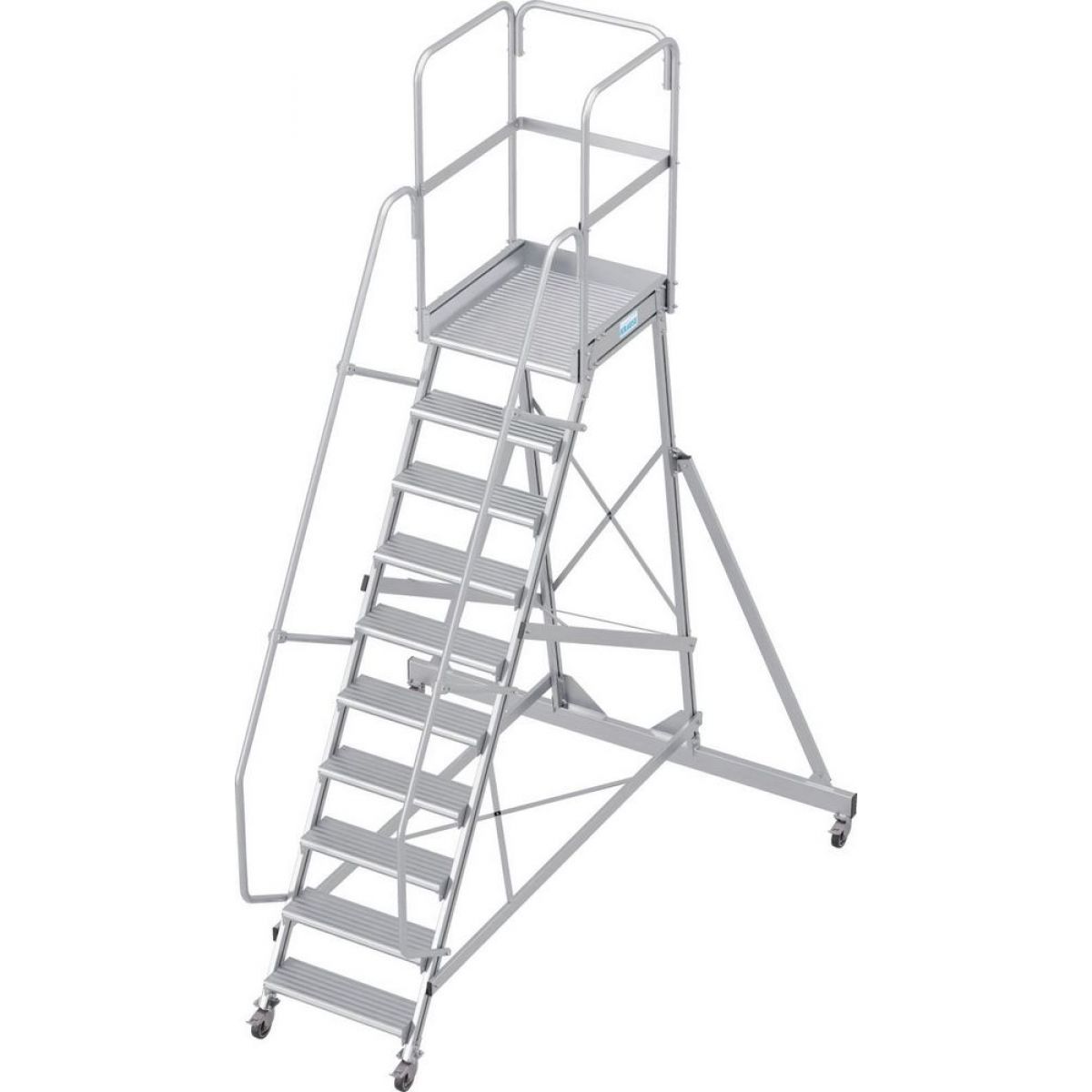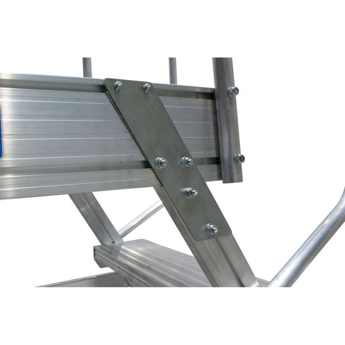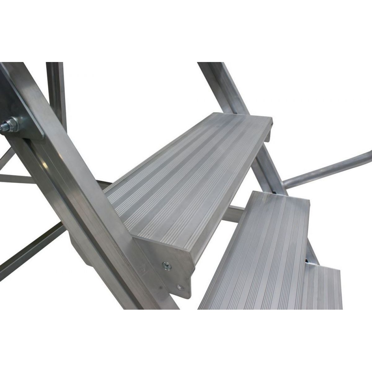 - Широкие ступени из алюминия, двусторонние перила и трёхстороннее ограждение площадки.