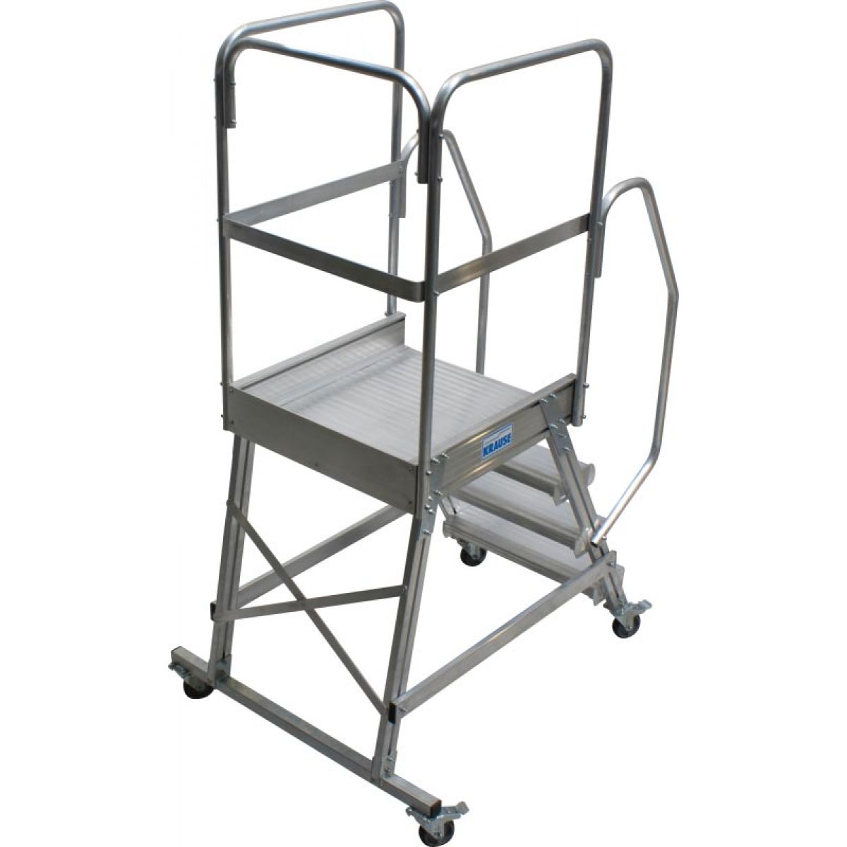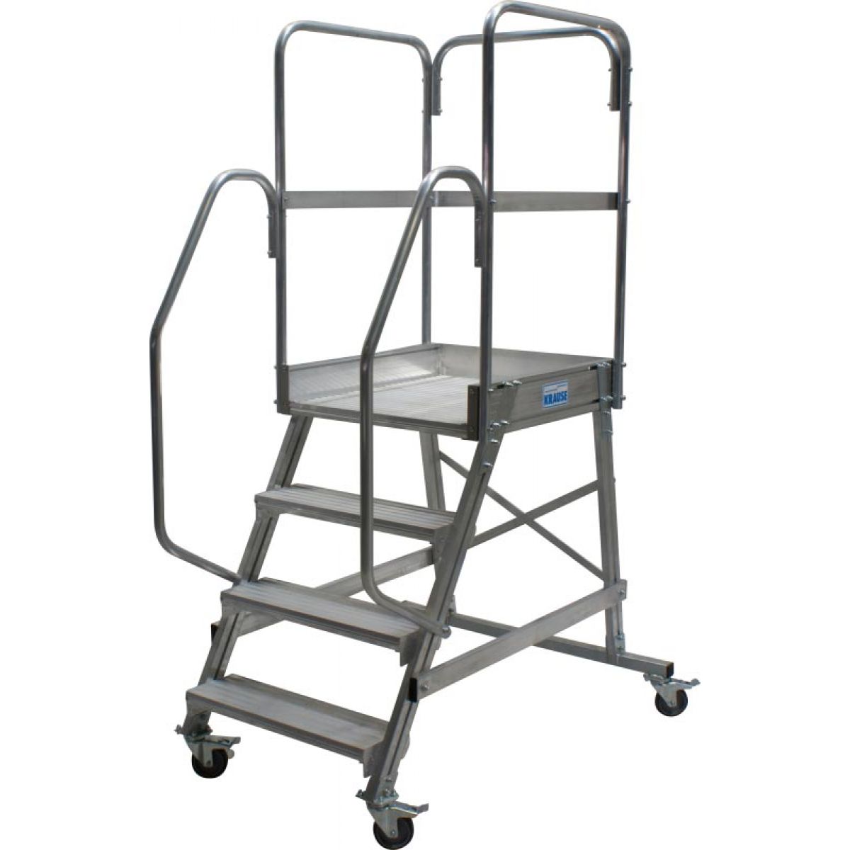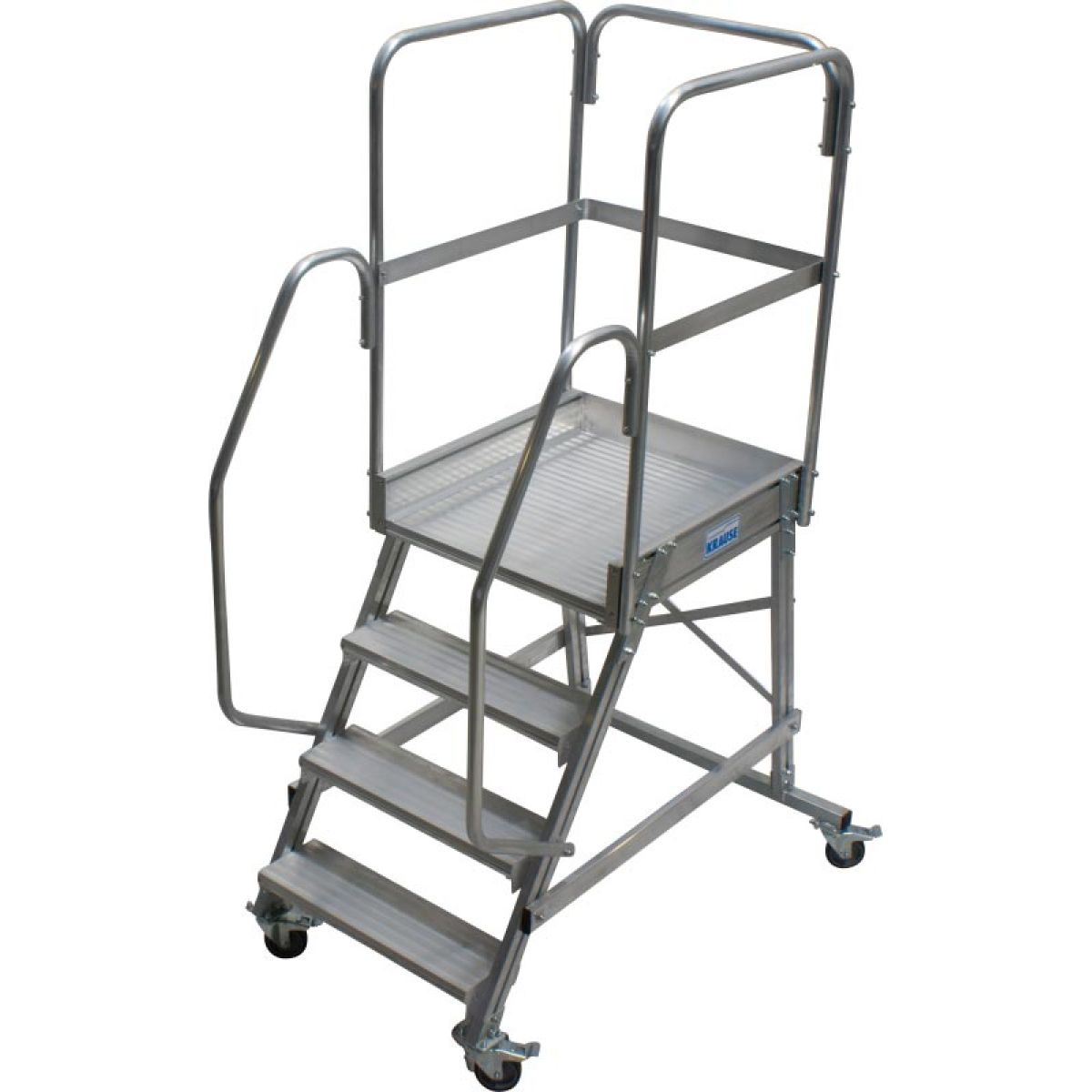 - Широкие ступени из алюминия, двусторонние перила и трёхсторонее ограждение площадки.