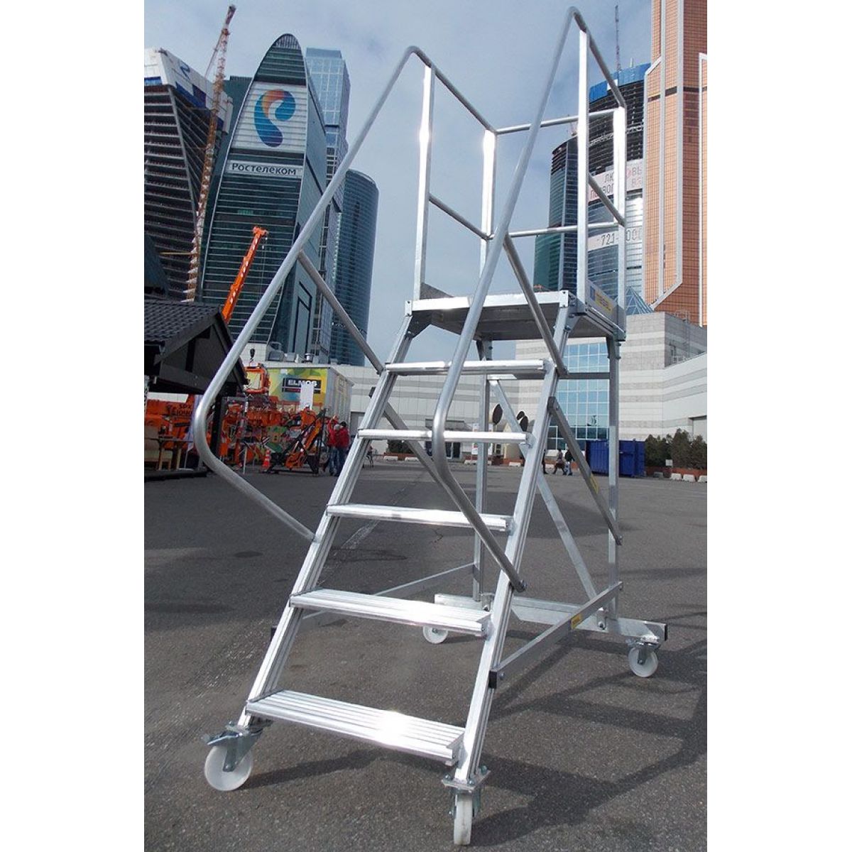- Для безопасного подъема вышка-стремянка оборудована поручнями по всей длине лестничного марша.