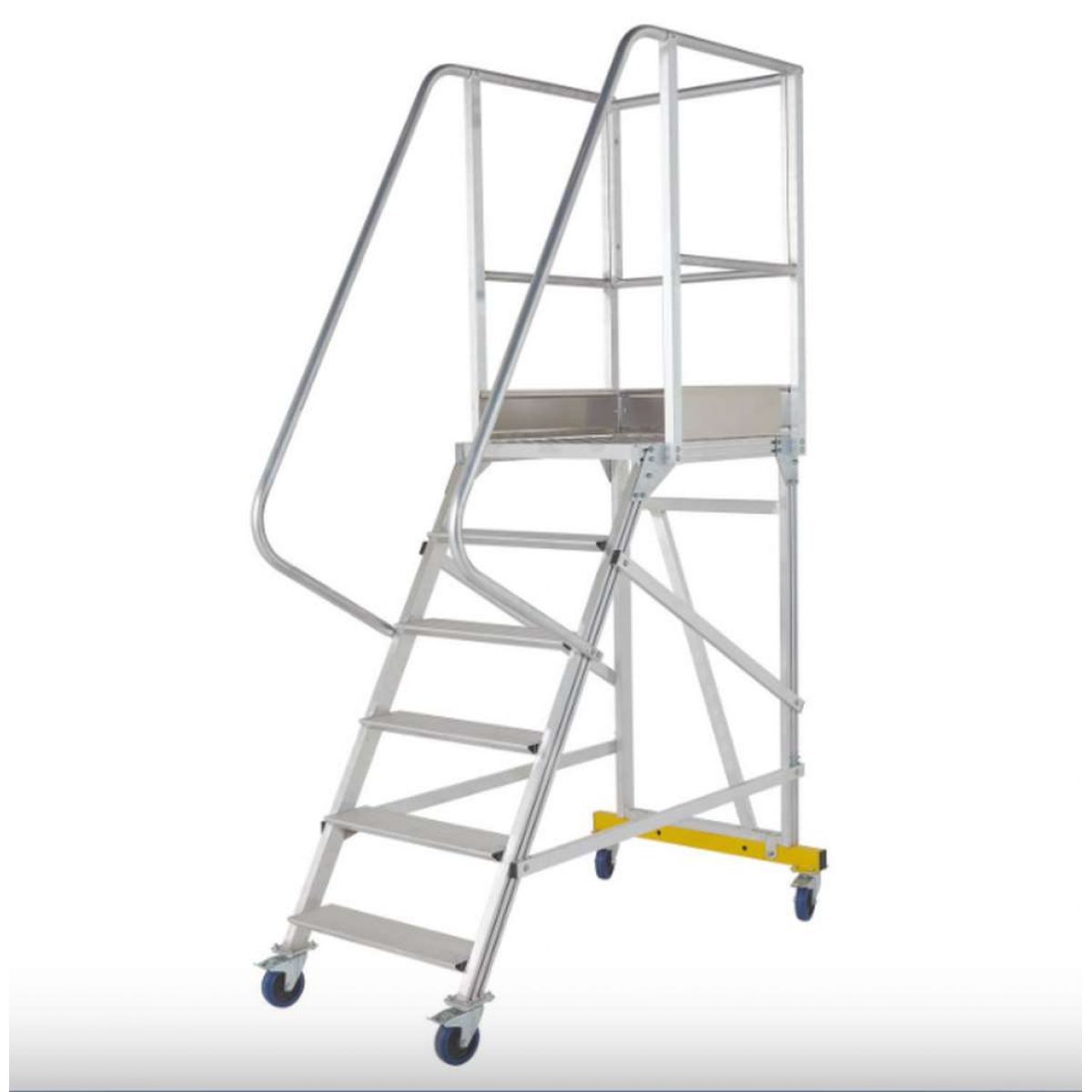 - Для безопасного подъема вышка-стремянка оборудована поручнями по всей длине лестничного марша.