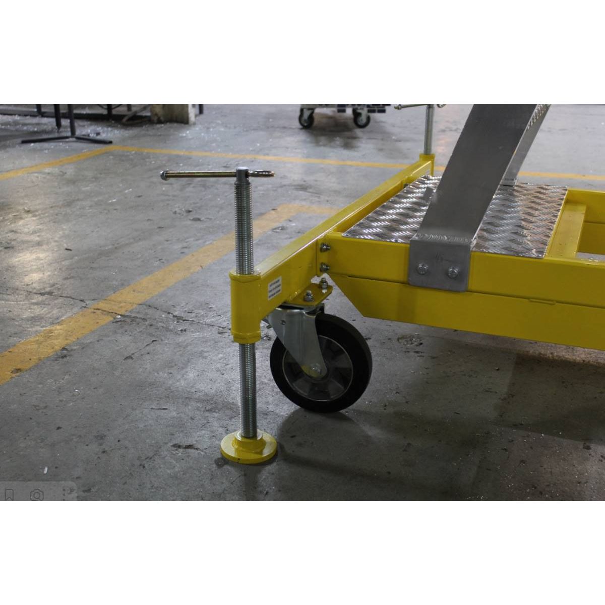 - Широкая траверса оборудована винтовыми опорами и неповоротными колёсами Ø200 мм