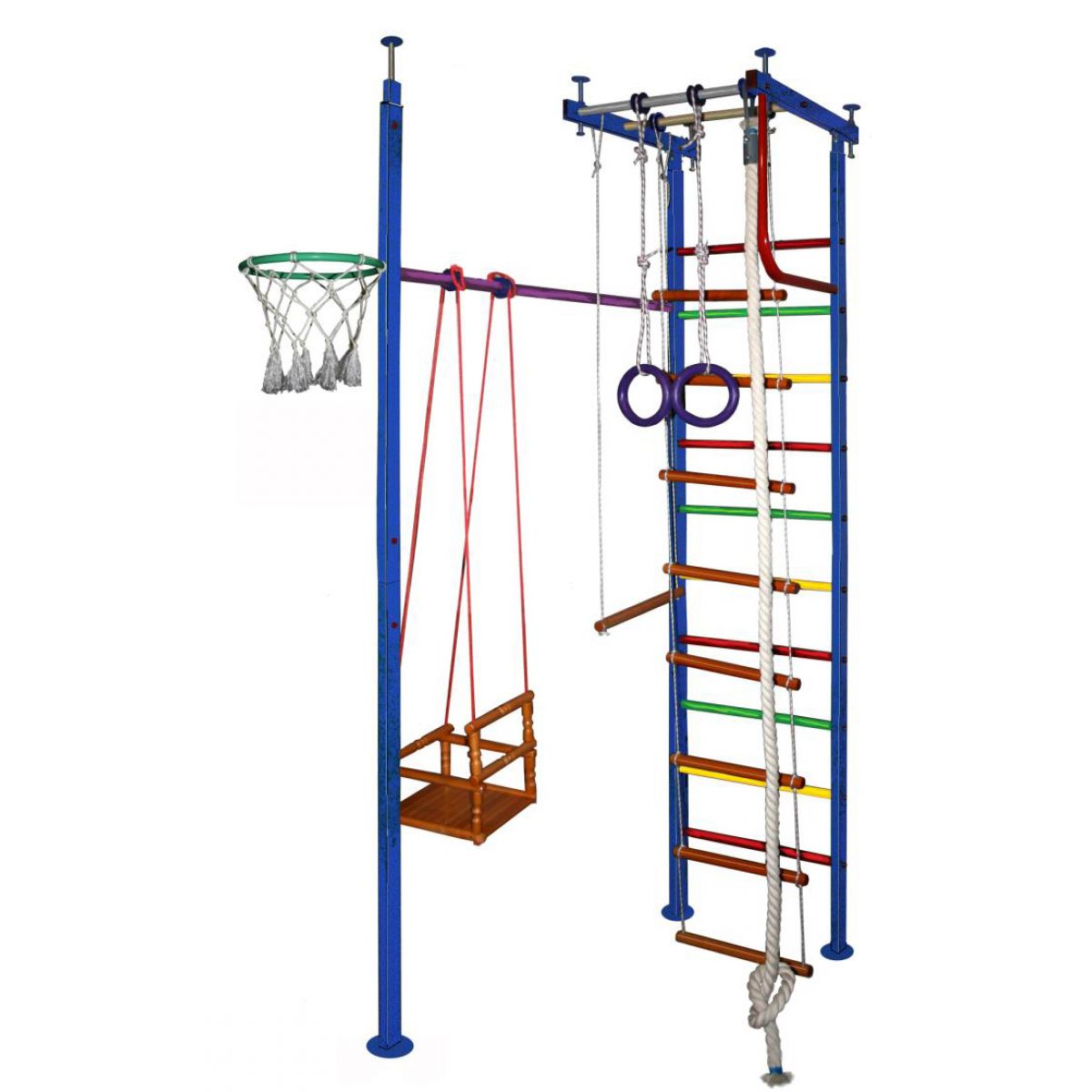 Базовая комплектация: металлическая шведская стенка, "Г"-образный турник, турник длинный, канат, кольца гимнастические, трапеция, баскетбольное кольцо, детские веревочные качели.