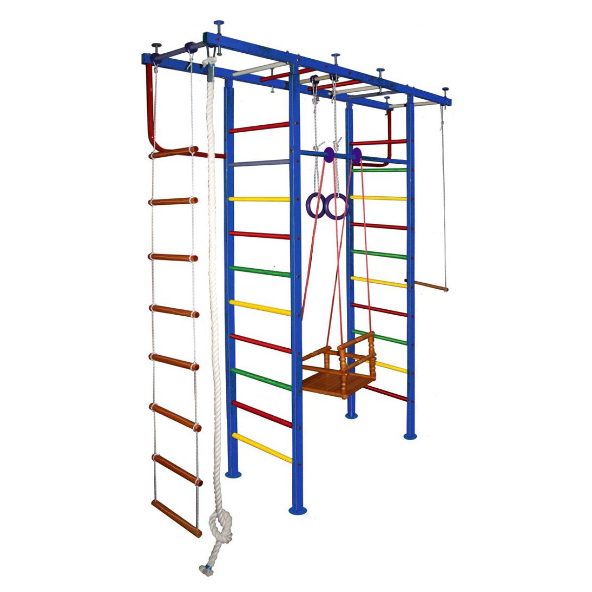 Базовая комплектация: две вертикальные металлические шведские стенки и одна горизонтальная - "рукоход", два "Г"-образных турника, турник длинный, канат, кольца гимнастические, веревочная лестница, трапеция,