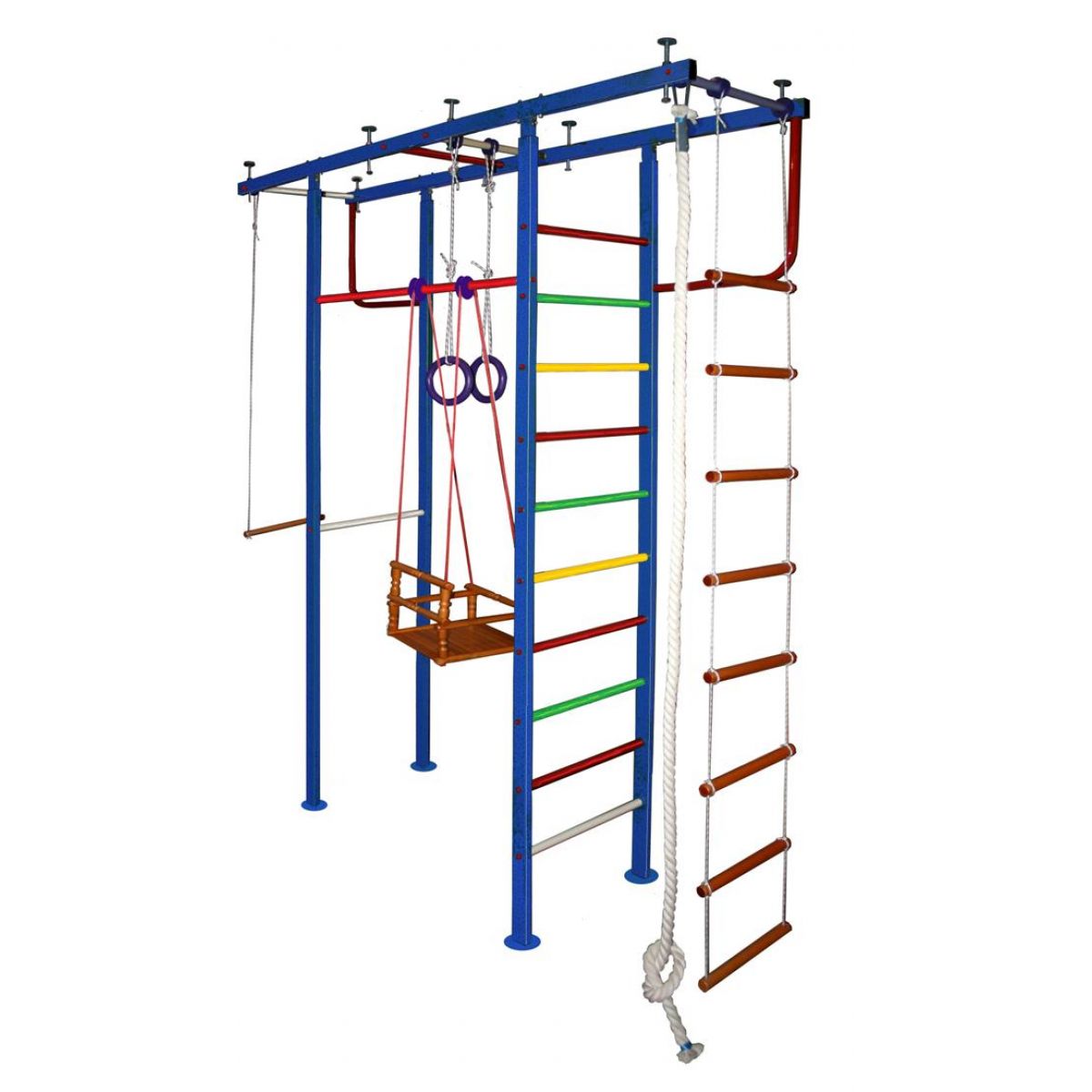 Базовая комплектация: металлическая шведская стенка, два "Г"-образных турника, перекладина-турник короткая, турник длинный, канат, кольца гимнастические, веревочная лестница, трапеция,