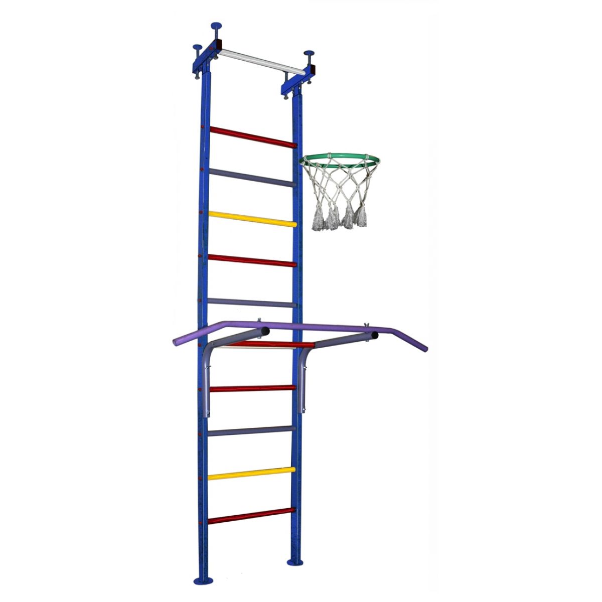 Базовая комплектация: металлическая шведская стенка, переставляемые брусья, турник съёмный, баскетбольное кольцо.