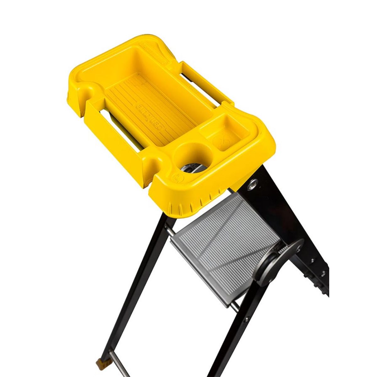 - Большая пластмассовая полочка-ротационная (занимает мало места, легко заменяется): 4 больших ячейки для инструментов, 2 специальных отверстия для прохода проводов, 2 ячейки для отверток, мерная шкала, крюк для ведра