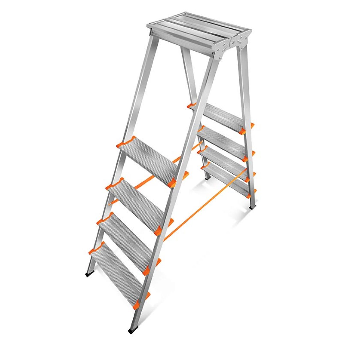 - Конструкция данных стремянок позволяет работать попеременно с разных сторон. Не нужно совершать лишних движений и переставлять лестницу с места на место.