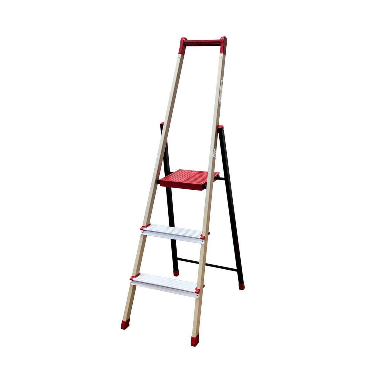 Поручень высотой 60 см оборудован крюком для ведра и лотком для хранения инструментов и крепежей. Благодаря соединению передней и задней стоек, стремянка в сложенном виде занимает всего 8 см по ширине ступени, что упрощает её хранение и транспортировку.