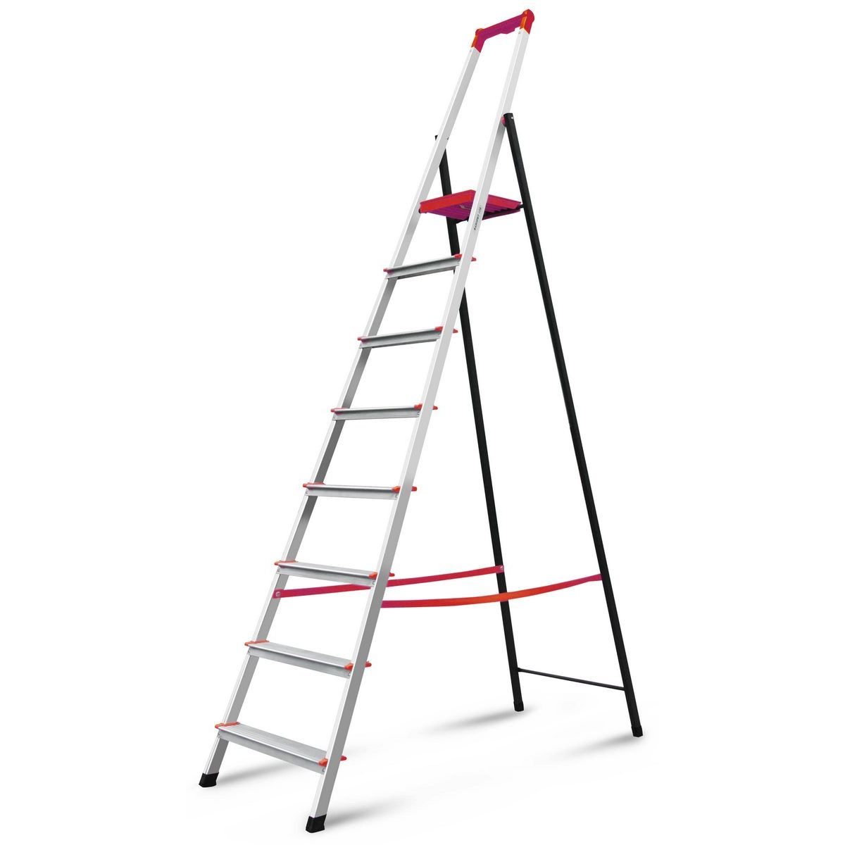 Поручень высотой 60 см оборудован крюком для ведра и лотком для хранения инструментов и крепежей. Благодаря соединению передней и задней стоек, стремянка в сложенном виде занимает всего 8 см по ширине ступени, что упрощает её хранение и транспортировку.