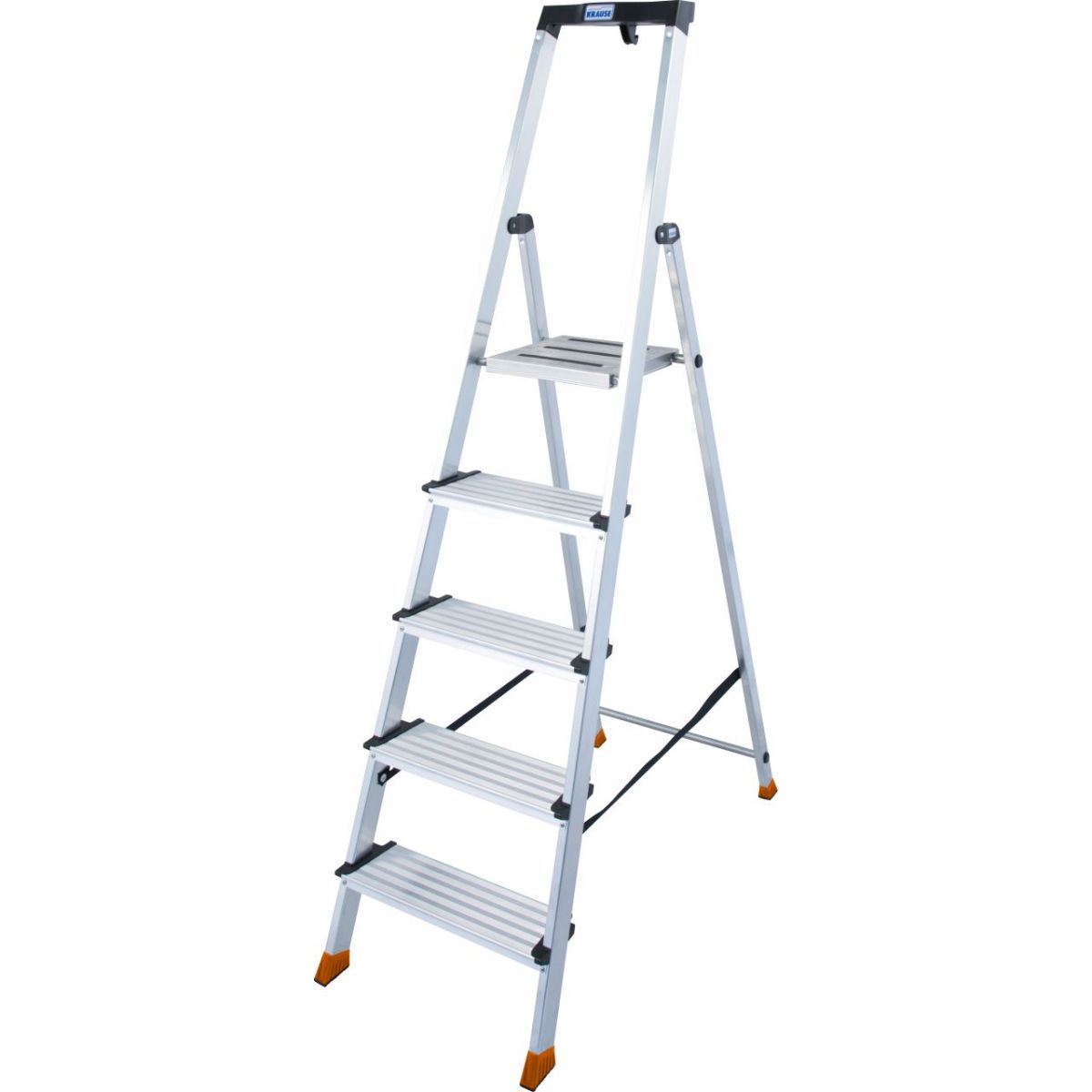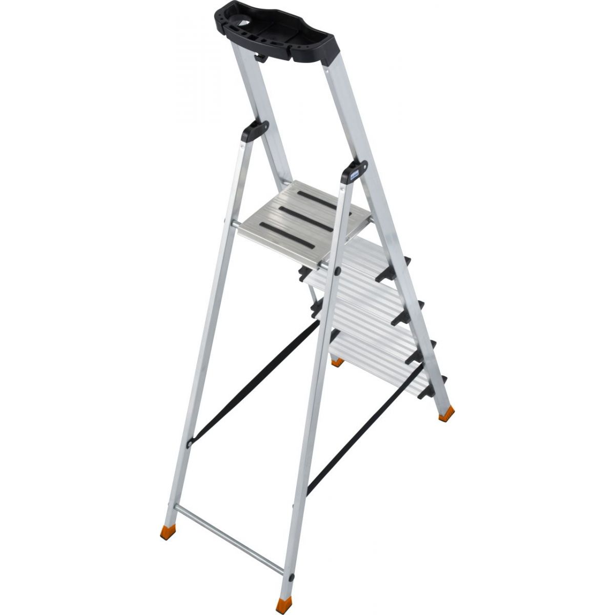 Алюминиевая лестница-стремянка с широкими ступенями- удобная и безопасная при подъеме и спуске.