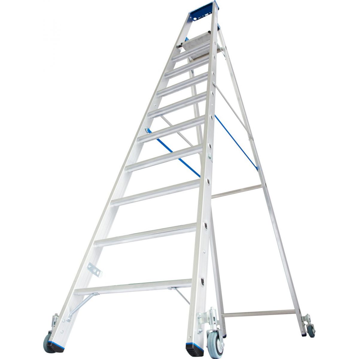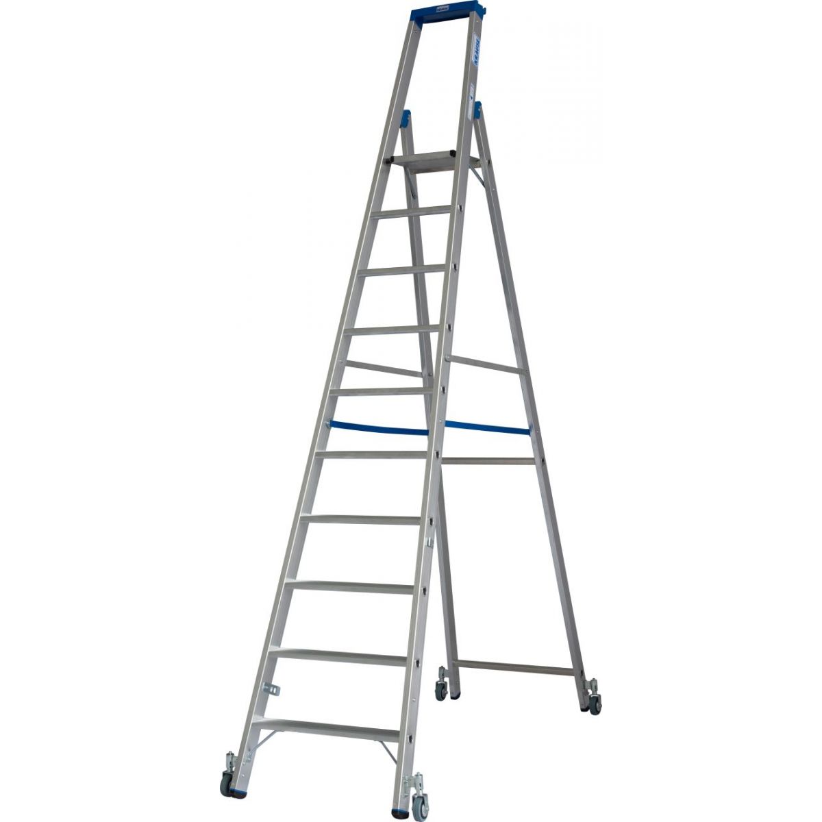 - Передвижная односторонняя алюминиевая стремянка с 4 самоблокирующимися роликами 80 мм, с автоматикой „Roll/Stop" для профессионального применения в стесненных условиях