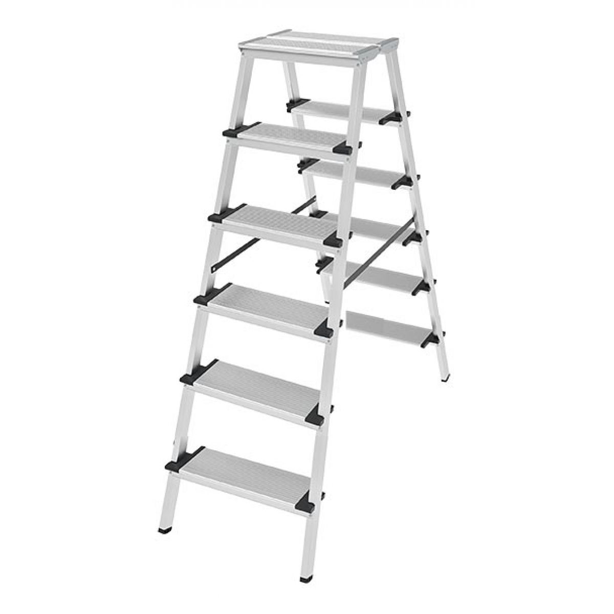 - Ориентация ступеней на обе стороны позволяет работать, не переставляя стремянку и тем самым экономя время