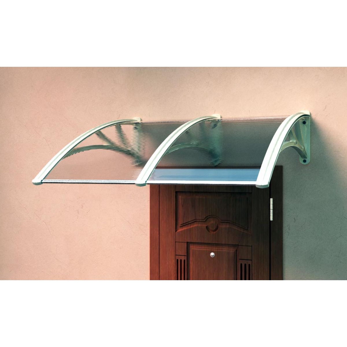 Кронштейны изготовлены из пластика, а сам козырек из поликарбоната толщиной 6 мм. Выдерживает ветровую и снеговую нагрузку.
