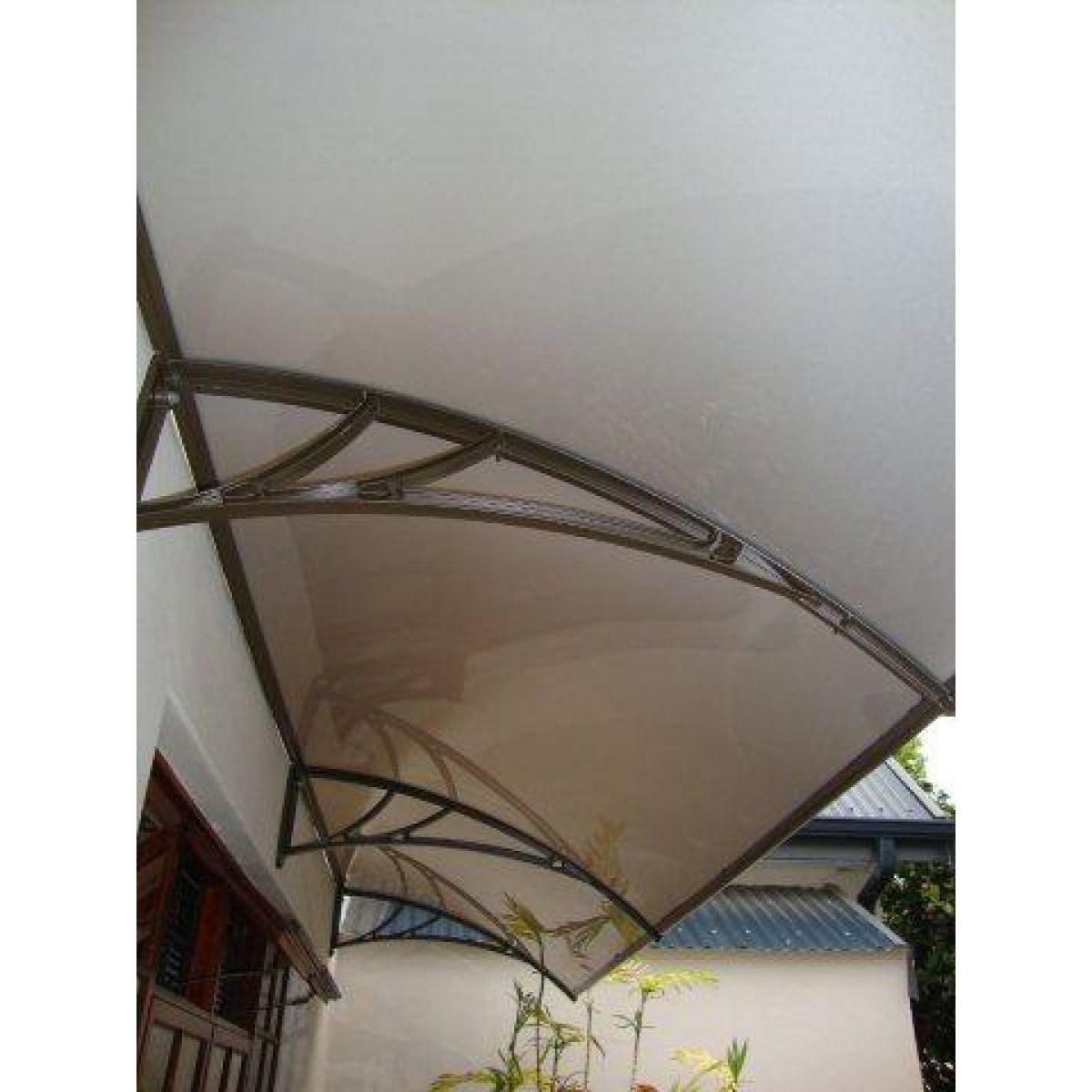 Они достаточно легкие. Вес одного козырька, к которому прилагается также крепеж и герметик - примерно 4 кг. Они состоят из легких листов поликарбоната и каркаса из прочного полипропилена, которые не создают нагрузку.
