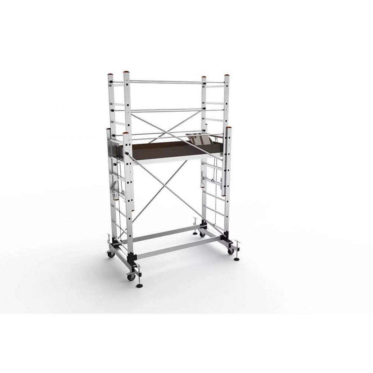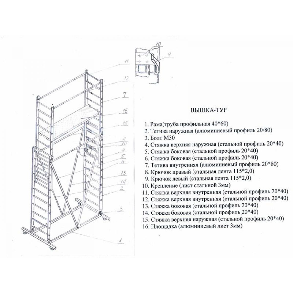 - Вышка-тур имеет огражения, являющиеся средством защиты на высоте, а так же увеличивающие жесткость конструкции.